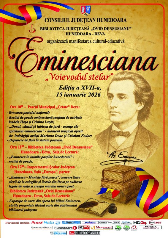 Fidelă tradiției încetățenite de mulți ani încoace, și în acest miez de ianuarie 2026, ziua de naștere a lui Mihai Eminescu, Ziua Culturii Naționale – 15 ianuarie, va fi serbată cu prețuire, respect și neuitare de către Biblioteca Județeană „Ovid Densusianu” Hunedoara – Deva. Poetul nostru național, reper fundamental al spiritualității românești, va fi omagiat printr-o manifestare culturală specială, organizată cu sprijinul generos al Consiliului Județean Hunedoara.