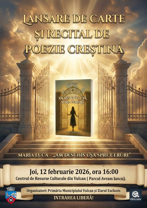 Acesta o va avea în centrul atenției pe apreciata poetă Maria Luca din localitate, care-și va prezenta, în cadrul unui eveniment de mare sensibilitate, cea mai recentă carte de versuri: „Am deschis ușa spre ceruri”, volum de versuri publicat la finalul anului 2025 la Casa de editură Exclusiv.