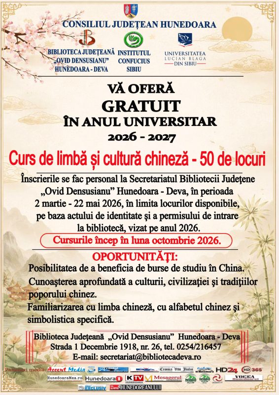 În acest context, Biblioteca Județeană „Ovid Densusianu” Hunedoara –Deva anunță organizarea în continuare a cursurilor gratuite de limbă și cultură chineză și în anul universitar 2026 – 2027.