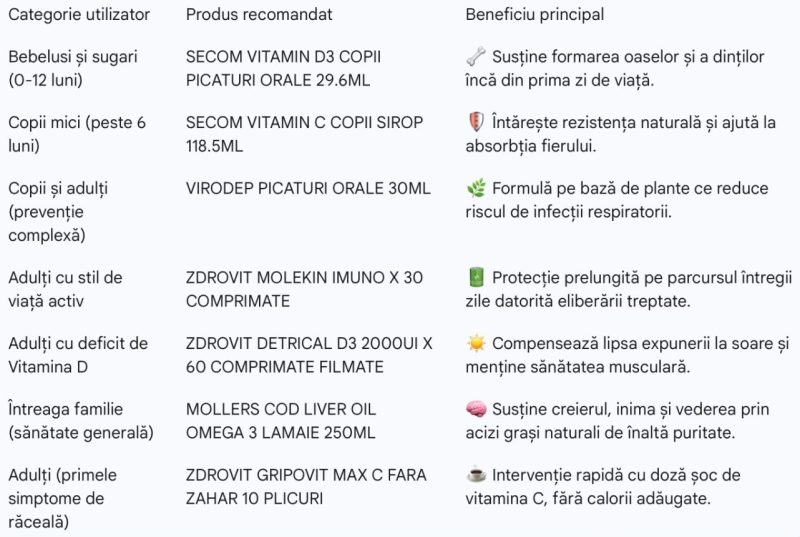 - Vitamina D: susține funcția imunitară și sistemul osos