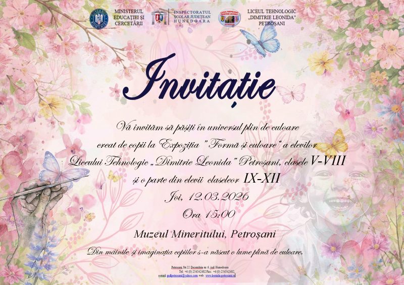 Muzeul Mineritului din Petroșani găzduiește joi, 12 martie, începând cu ora 15.00 o inedită expoziție de desene, avându-i ca autori pe elevii de la Școala gimnazială nr. 2 și de la Liceul Tehnologic „Dimitrie Leonida” din Petroșani.