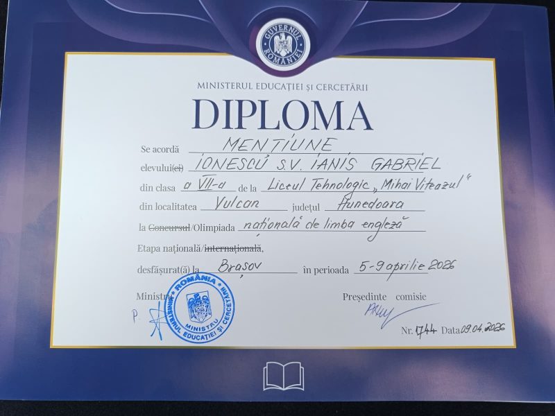 Elev în clasa a VII-a Școlii gimnaziale nr. 5, structură a Liceului Tehnologic „Mihai Viteazu” din municipiul Vulcan, Ianis Gabriel Ionescu a fost distins cu Mențiune la Olimpiada Națională de Limba Engleză, desfășurată în aceste zile la Brașov.