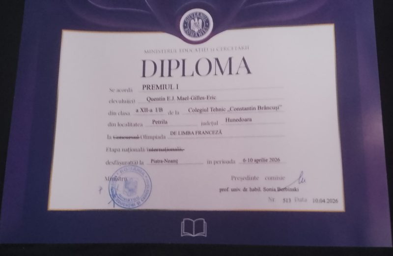 Performanță deosebită în Educație pentru elevul Quentin Maël-Gilles-Eric de la Colegiul Tehnic „Constantin Brâncuși” din Petrila.