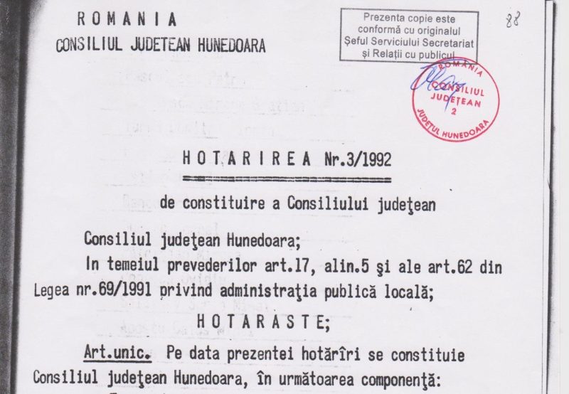 În urmă cu 34 de ani, la data de 16 aprilie 1992, în baza legii nr. 69/1991 lua ființă Consiliul județean Hunedoara odată cu prima reuniune a forului administrației județene. Din componența primului Consiliu județean Hunedoara au făcut parte: Ladislau Farcaș, Valeriu Miclăuș, Aurel Anca, Virgil M. Dumitru, Gligor Hașa, Cristian Serafim Leucian, Florea Bereș, Sigismund Duma, Gheorghe Dreghici, Nicolae Jurca, Aurel Oprișa, Ioan Rob, Zoltan Fekete, George Nistor, Dragoș Vonica, Pompiliu Prip, Petru Mîrza, Gabriel Cristescu, Ladislau Eory, Petru Păsculescu, Mircea Grațian Rădulescu, Dumitru Florin Țurnă, Stelian Pușcașu, Ionel Iștfan, Ioan Bencovici, Cornel Burlec, Mircea Pătrînjan, Ovidiu Popescu, Sorin Mihai Szilaghy, Caius Mihai Apostu, Adorian Soare, Ioan Radu, Ioan Iliescu, Ioan Ovidiu Muntean, Dan Dănilă, Nicolae Păcurar, Petru Ișfan, Virgil Moroșan, Ioan Uifăleanu, Gheorghe Răileanu, Virgil Chiș, Alexandru Pop, Adrian Rovinaru, Ioan Nicolae Căpraru și Costel Alic.