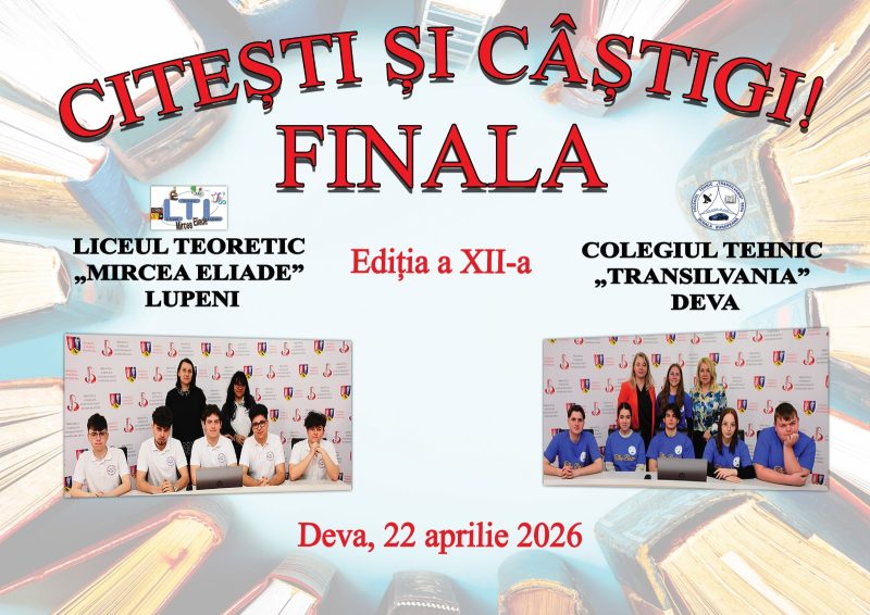 Ediția a XII-a a concursului județean „Citești și câștigi!”, cel mai popular concurs de cultură generală din mediul educațional hunedorean, a ajuns astfel în fața confruntării finale. Aceasta va avea loc miercuri, 22 aprilie 2026, în avanpremiera Zilei Naționale a Bibliotecarului (sărbătorită pe 23 aprilie). În marea finală din acest se vor întrece echipele de la Liceul Teoretic „Mircea Eliade” din Lupeni și Colegiul Tehnic „Transilvania” Deva.
