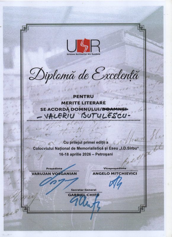 Seria distincțiilor menite să recunoască oficial opera și cariera literară a unuia dintre cei mai valoroși reprezentanți ai culturii literare românești contemporane, i-a adus reputatului om de cultură Valeriu Butulescu „Premiul pentru merite literare” al Uniunii Scriitorilor din România. Distincția i-a fost înmânată acestuia la Gala „I.D. Sîrbu” de la Teatrul Dramatic „I.D. Sîrbu” din Petroșani, de către președintele Uniunii Scriitorilor din România, Varujan Vosganian, eveniment organziat la finalul primei ediții a Colocviului Național de Memorialistică și Eseu „Ion D. Sîrbu” care s-a desfășurat, la jumătatea lunii aprilie, la Petroșani, în organizarea Bibliotecii județene „Ovid Densușianu”.